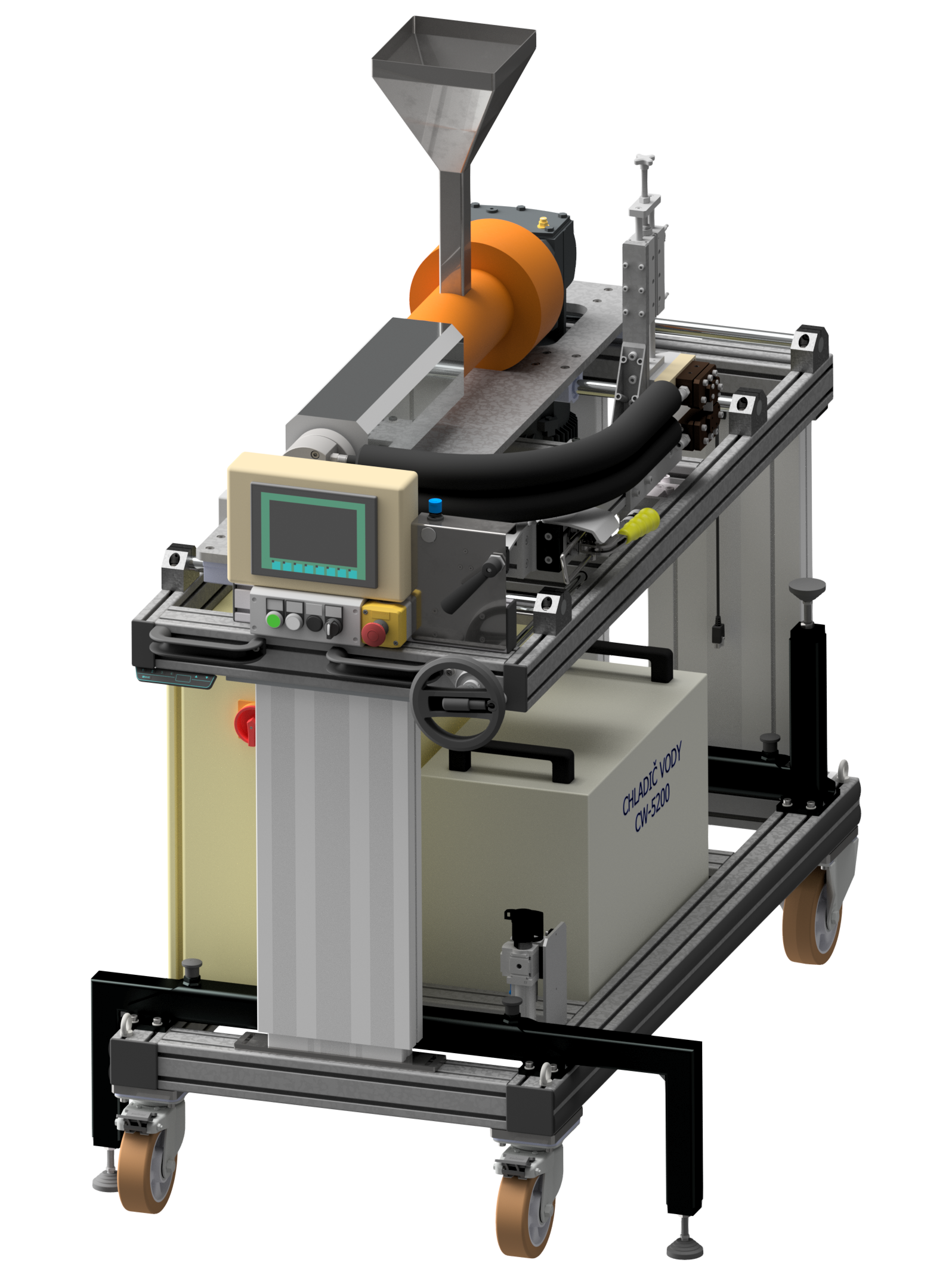 Kompaktní mobilní extruder s vlastním chladičem na výškově stavitelném stole. Slouží pro ošetření okrajů vyráběných sít proti otřepení.