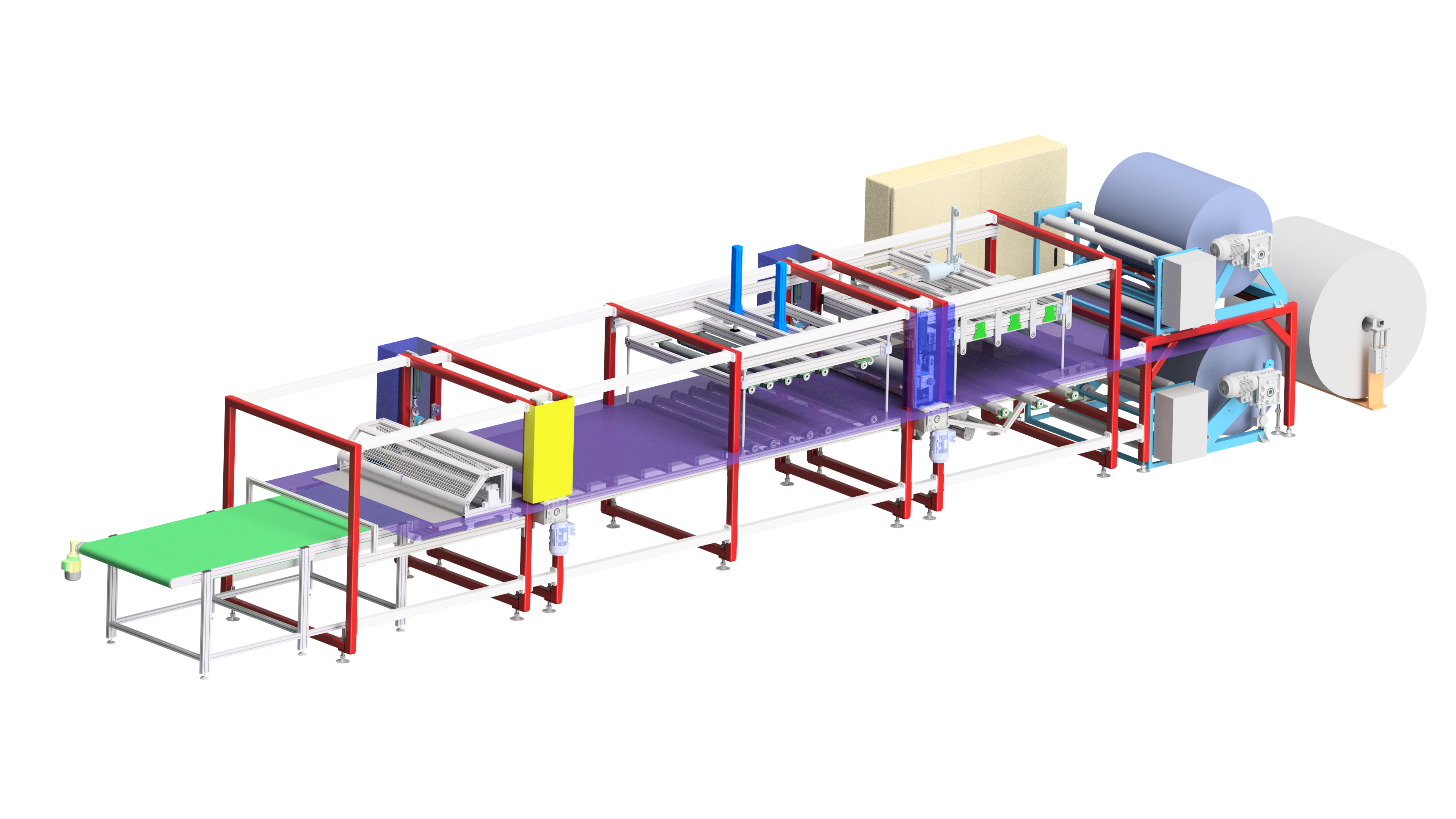 Laminační linka pěnových materiálů navržená ve spolupráci se zákazníkem. Tvorba dokumentace, pomoc při montáži a zprovoznění.